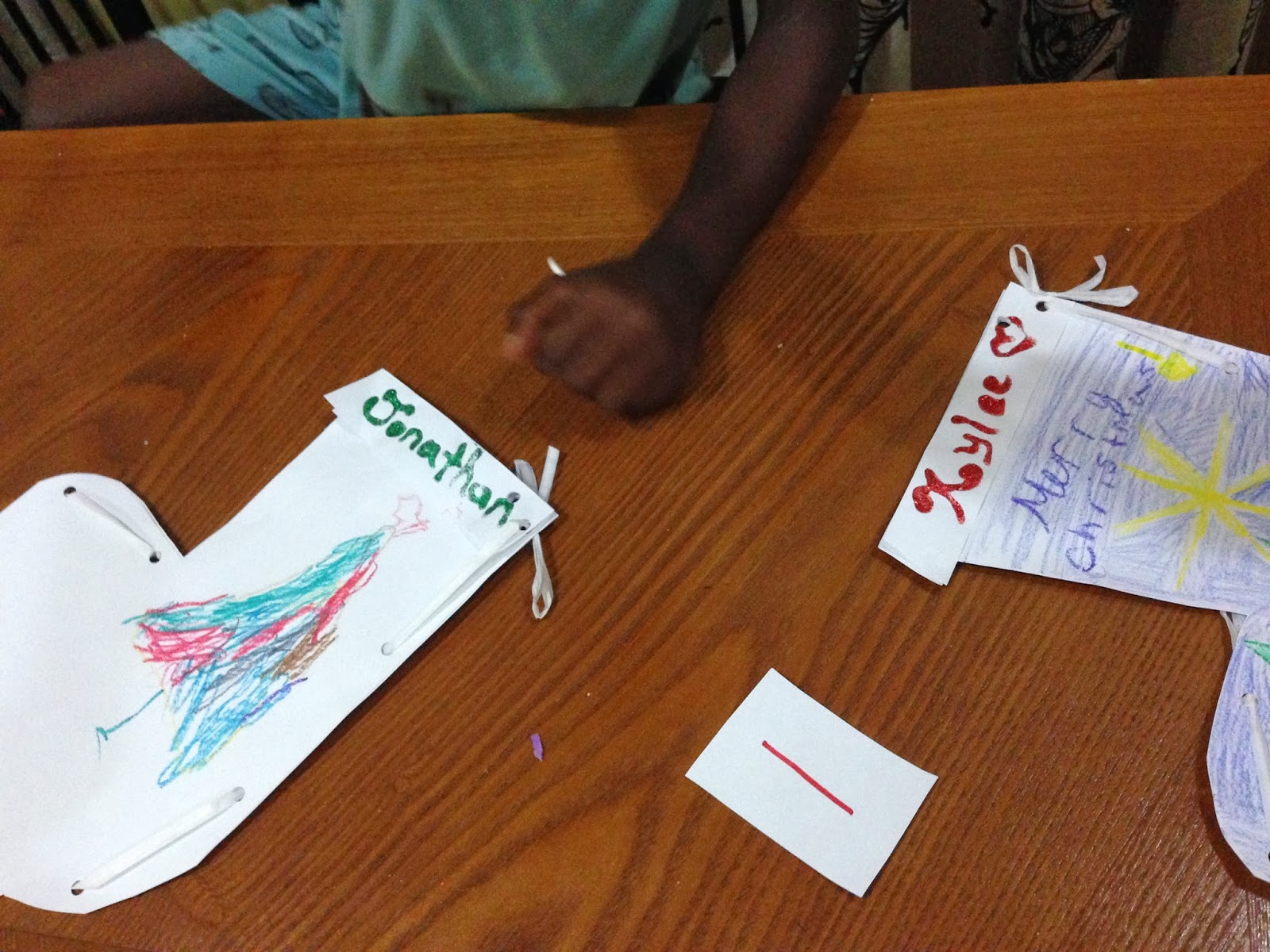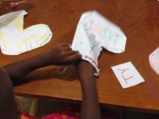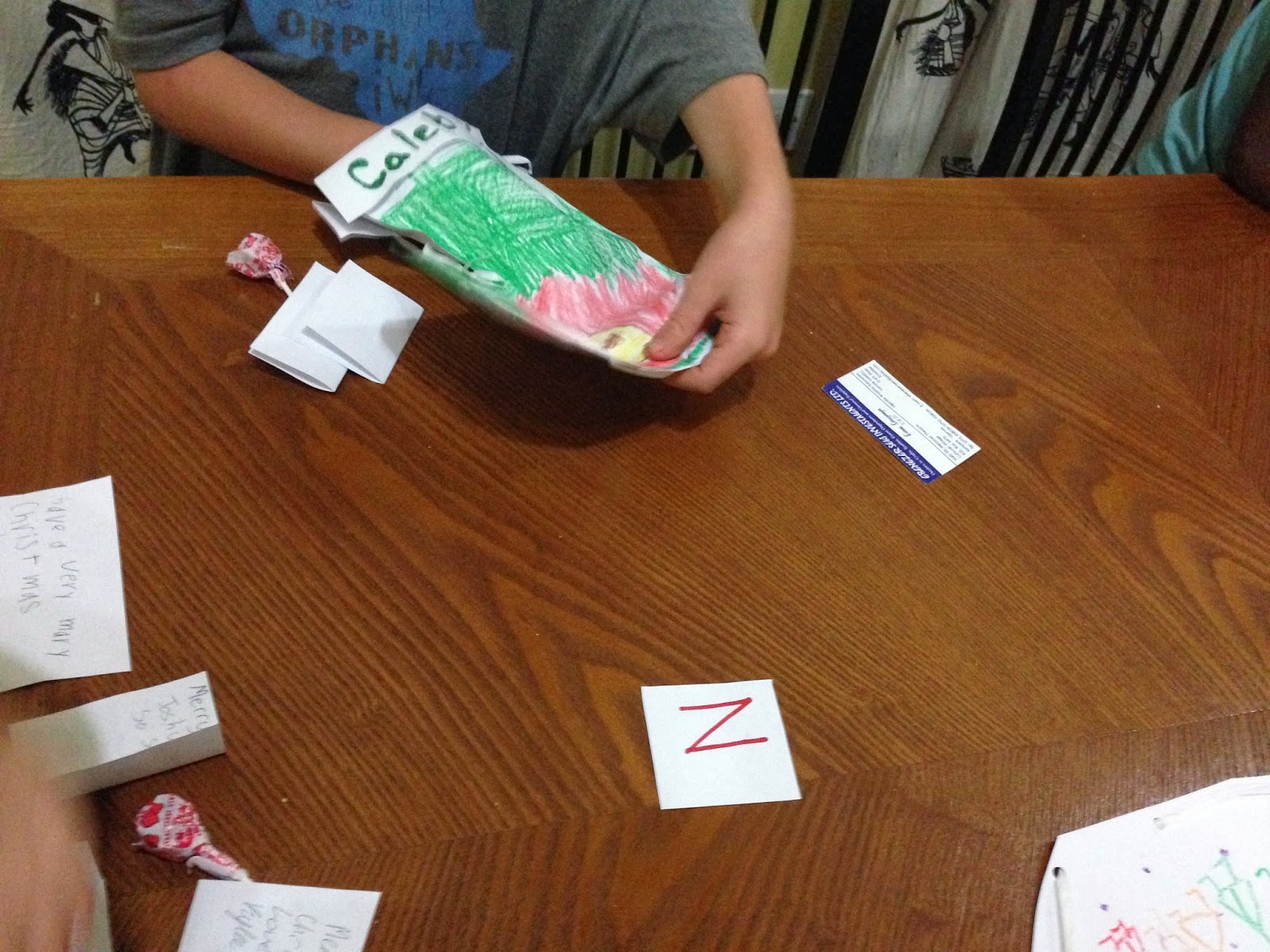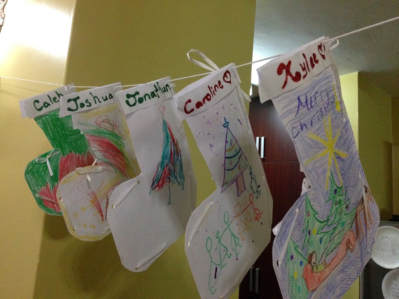 So in celebration of St. Nicholas’ life and all that we might learn from him–the kids did research and then shared it with the other families in the compound. We then made stockings. Tonight inside the stockings the big kids wrote and stuffed messages to the littles and one another. I placed a letter (or two) in each stocking that spelled the word: NATIVITY. The idea being that they will have to unscramble the letters and then I have a poem that tells them to look around the apartment to find the nativity that is hidden under a towel. (Nick didn’t get the creds…but thought the stockings would be a fun place to leave the letters!) I am SO excited that Caroline will be given–almost exactly what she asked for BEFORE Christmas–and be able to enjoy it all month long!