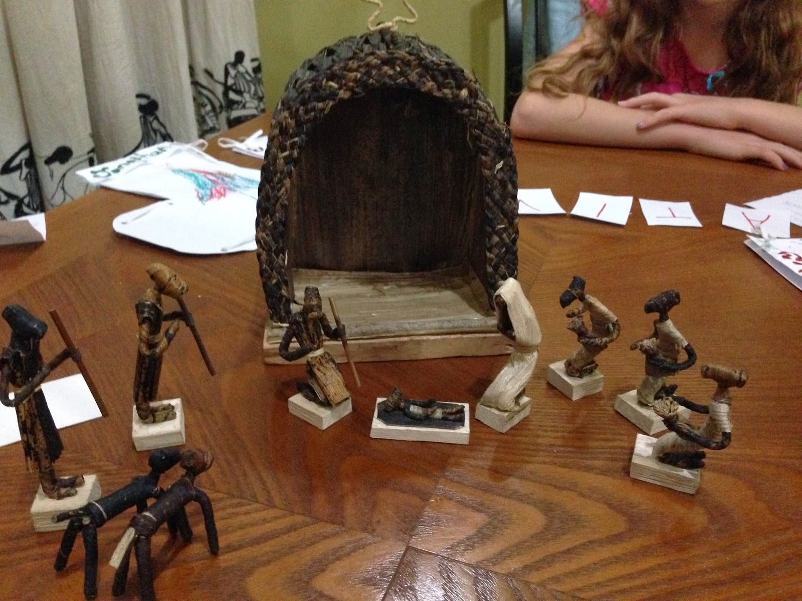 While all of this was going on and the big kids were gathering information…Caroline and I snuggled and read the FEW Christmas books that I have and we talked about Christmas. She shared that she did not have any special meals on Christmas day, “no mom, just rice and beans.” And when I asked if she had ever had a Christmas present she said, “no mom.” Silence. I was pretty sure I knew the answer but it still saddened me. Not from an aunt or uncle…no presents for Christmas…ever. So I said, “Well, this Christmas would you like a Christmas gift?” Her eyes lit up and she said, “yes.” I asked, “what do you think you would like?” She explained, “I would like a wooden sheep, Mary, and baby Jesus…” and basically went on to described a wooden nativity. I do not know if this is because we had been reading about a wood-carver who carved a nativity, or if this was her hearts’ desire, but I was instantly thrilled because I had purchased over a month ago–not a wooden–but a Ugandan nativity for all my children to enjoy this Christmas. I had been waiting for the right time to present it–and it seemed that sooner rather than later would be appropriate. So, I thought, on the day of St. Nicholas’ death–or the celebration of his life: December 6th, just might be the perfect day to receive the gift.